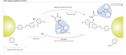 - Amino Acid Coupling: The new amino acid is protected using 9-fluorenylmethoxycarbonyl (Fmoc) or Tert-butoxycarbonyl (Boc) to prevent unwanted reactions. A coupling agent such as HATU, DIC, or EDC activates the carboxyl group which enables the formation of a peptide bond with the growing chain.