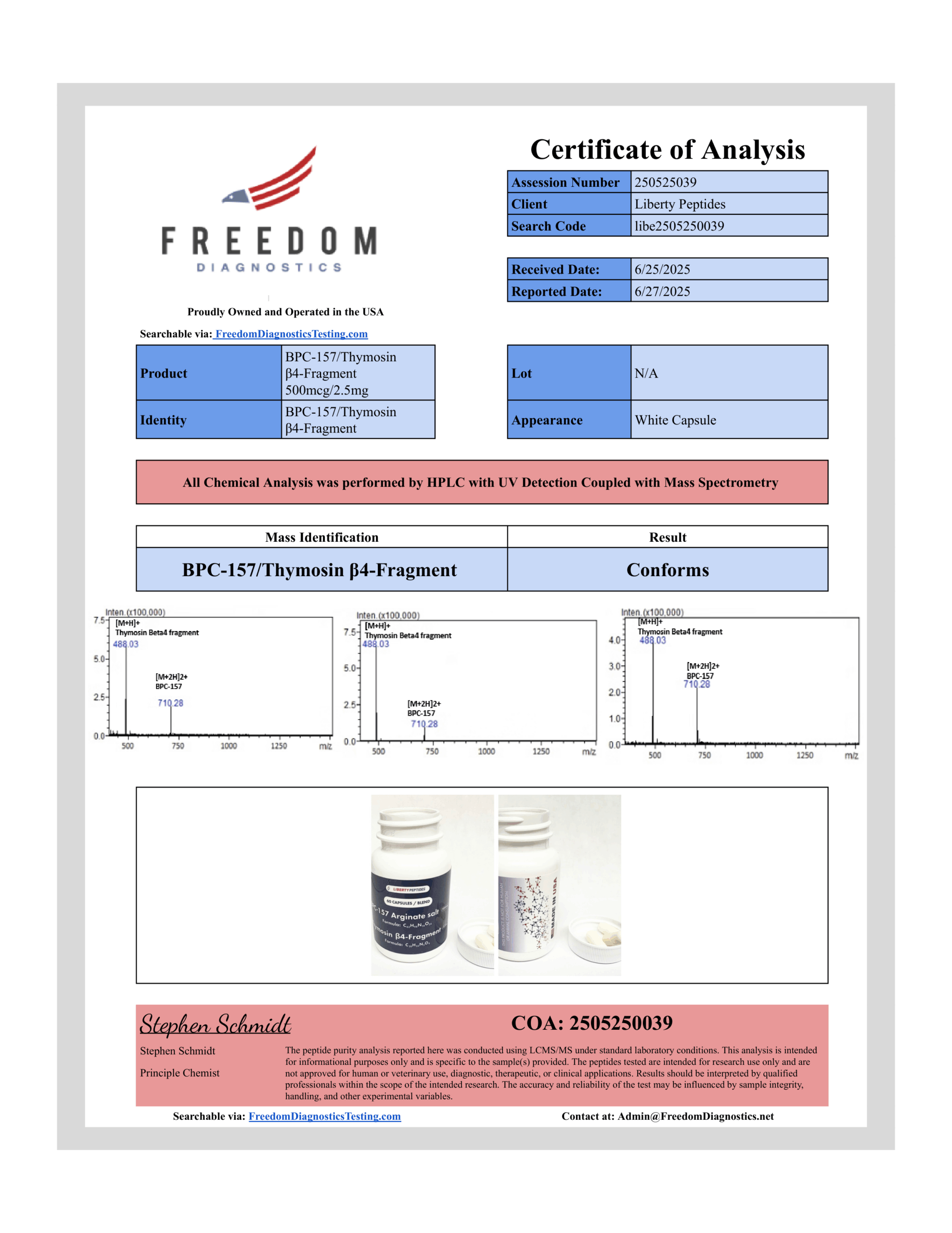 At Liberty Peptides, quality and integrity are very important. That’s why we’ve chosen to partner with Freedom Diagnostics for all our third-party Certificate of Analysis testing. Their reputation for precision, transparency, and cutting-edge technology makes them the gold standard in peptide validation.